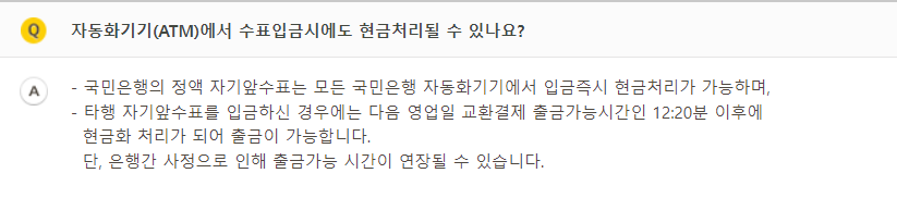 예를 들어 국민은행 수표를 국민은행 ATM기로 입금했다면 이때는 바로 현금으로 출금과 이체를 할 수 있습니다.