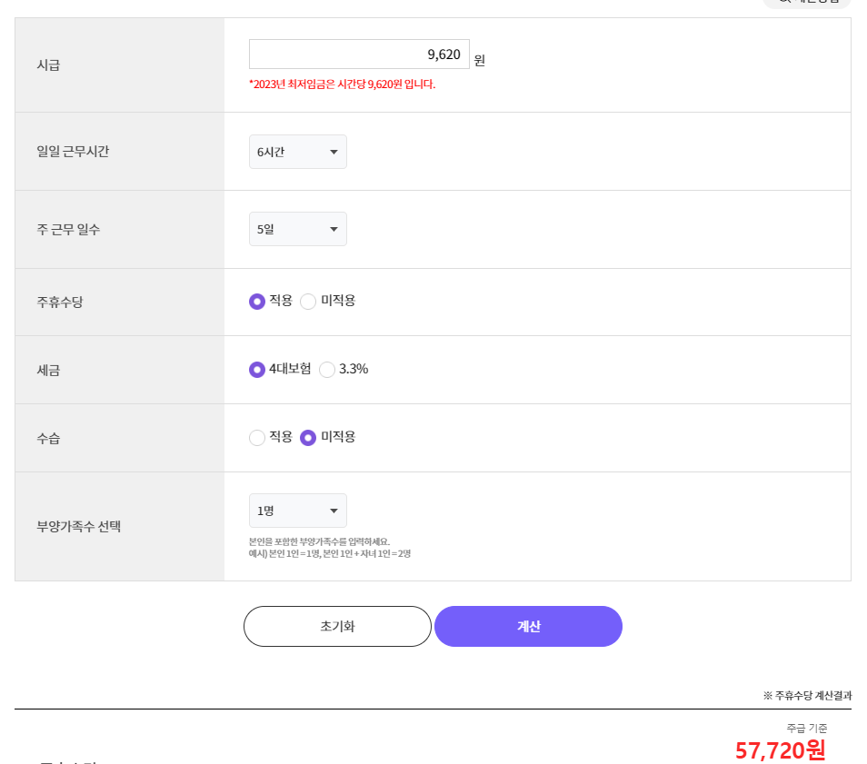 주휴수당 = 30시간/40시간 x 8시간 x9,620원 = 57,720원