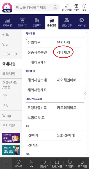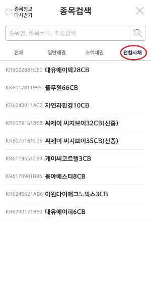- 앱에서 '금융상품 - 국내채권 - 장내채권 - 종목검색(돋보기) - 전환사채 탭 클릭' 하시면 매입 가능한
