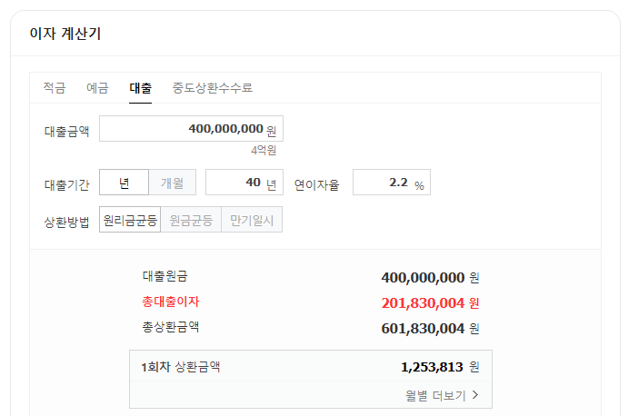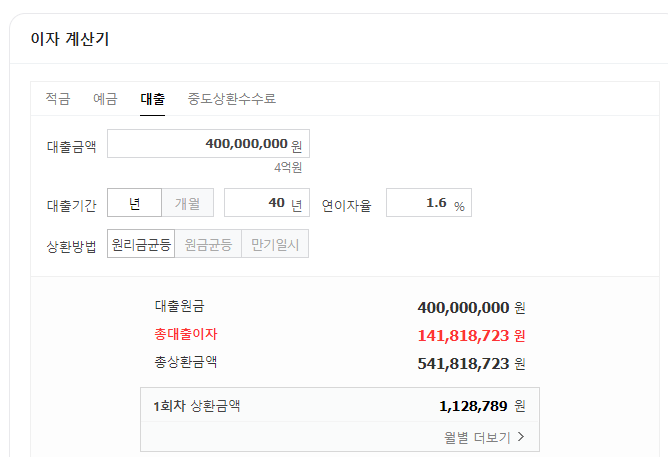 4억원 40년 만기 1.6% 금리 적용시 한달 상환해야 하는 원리금은 113만원 정도 됩니다. 결혼과 출산으로 우대금리를 받을 시 월 12만원을 절약하게 되네요.